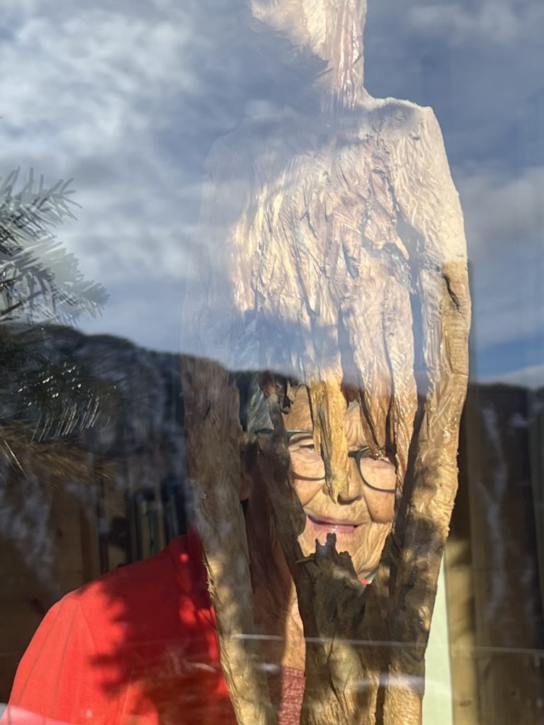 Ganz speziell ist das kunstvolle Fenster zum 2. Dezember. Ein Staute aus einem morschen Apfel- oder Birnbaum ziert das Fenster. Roh bearbeitet, mit markanten Spuren, mit wenig Detail und viel Ausstrahlung. Die Skulptur von Roman Wirth, Flawil, zeigt die Fragilität des Alterns, die Festigkeit eines langen Lebens, und die inhärente Schönheit in jedem. Die Figur, in welcher auch eine Jesus-Darstellung sichtbar sein kann, passt doch bestens zum kirchlichen Hintergrund der Adventszeit.